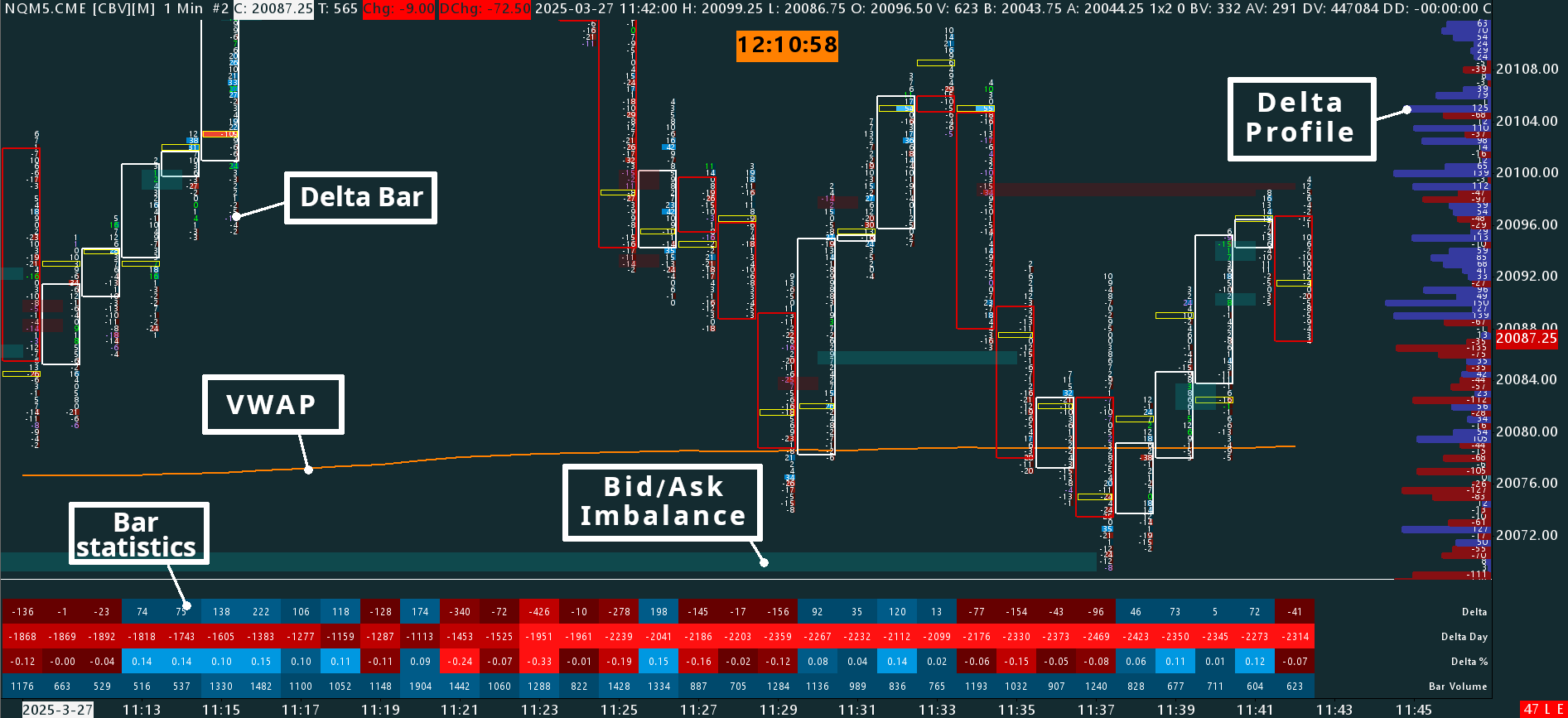 Sierra chart Nasdaq (NQ) 1-minutes chart showing the delta volume (Delta Footprint with 2 ticks aggregated). Red and cyan rectangles show Bid/Ask diagonal stacked imbalances. Delta volume by price on far right of the chart. Statistics of each bars are on the bottom of the chart.