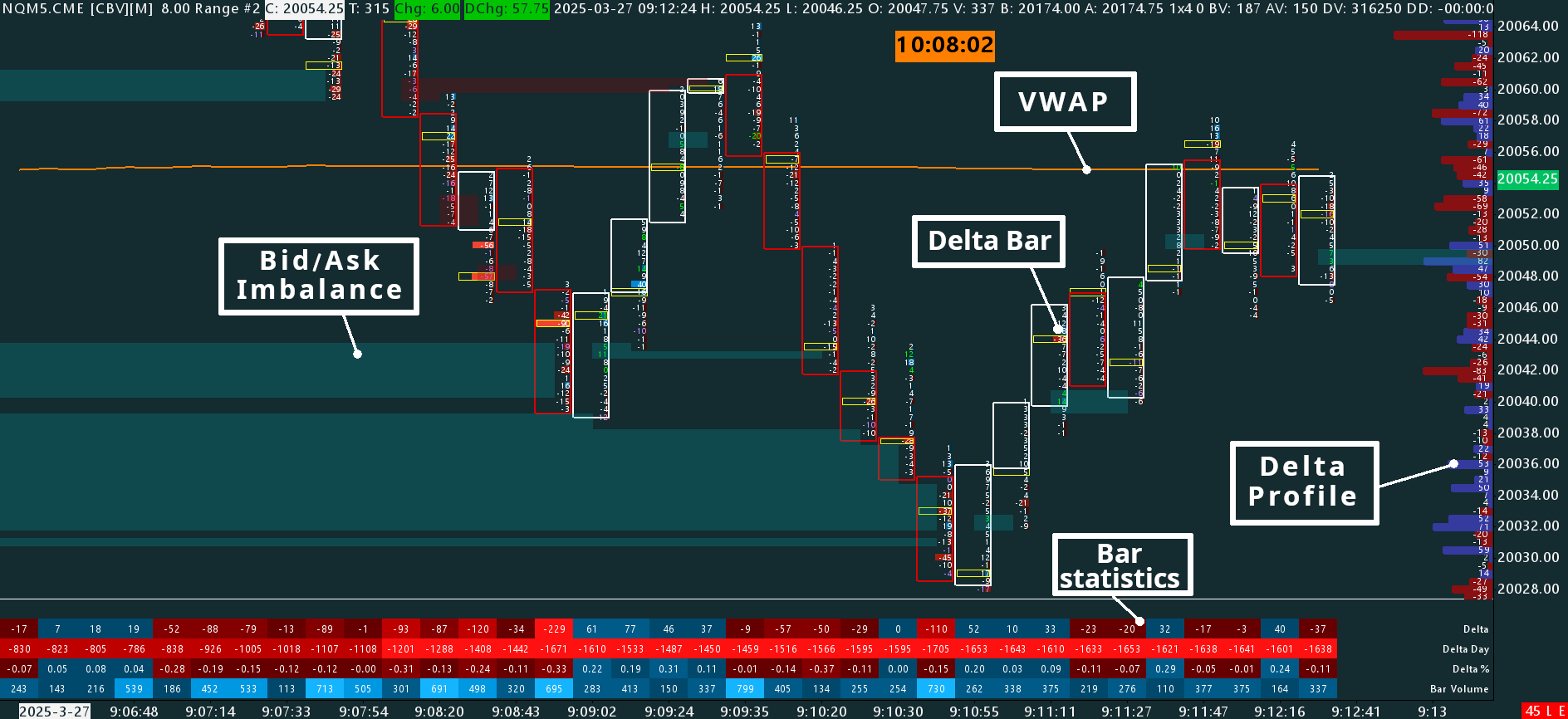Delta Footprint, Nasdaq, 32 ticks range bars